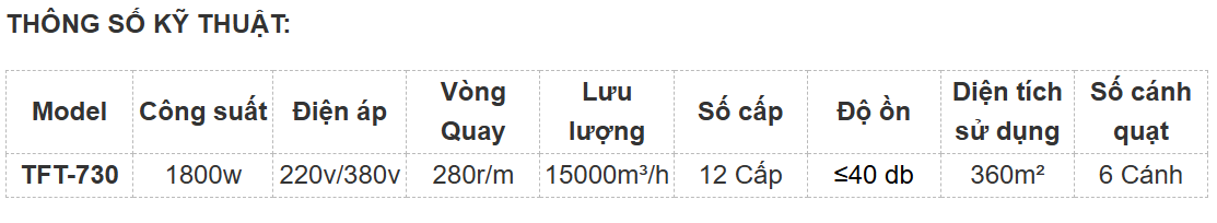 TFT-730 | 1800w | 220v/380v | 280r/m | 15000m³/h | 12 Cấp | ≤40 db | 360m² | 6 Cánh |